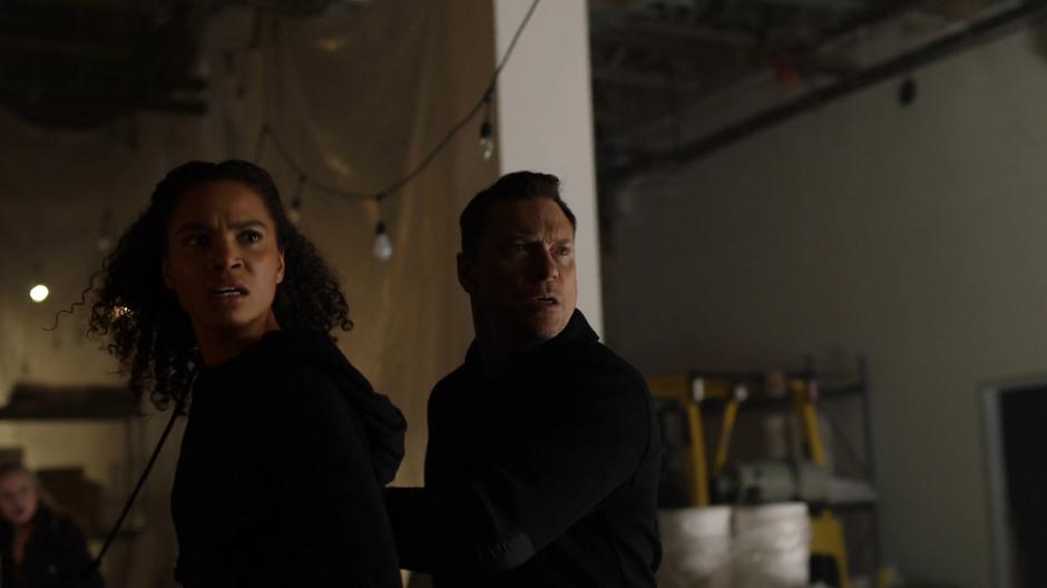 Tanya and one of the cultists turn around in surprise when Guardian bursts into the room.