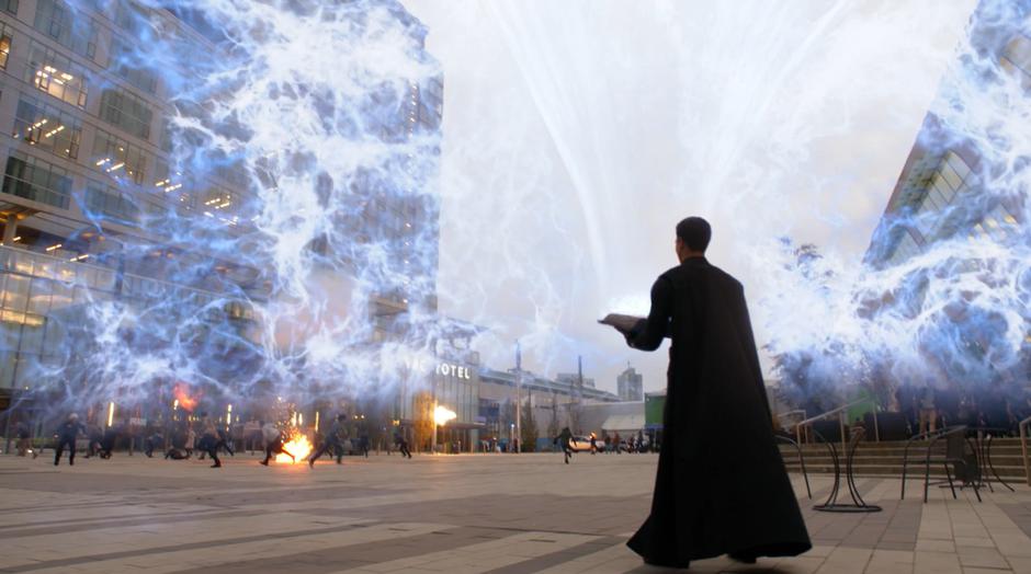 Deegan holds open the book to transform the universe while people run around in a panic.