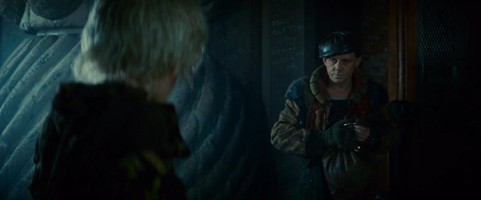 J.F. Sebastian talks to Pris in front of the door to his building.