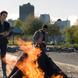 Lena casts the spell over the bonfire while William takes notes.