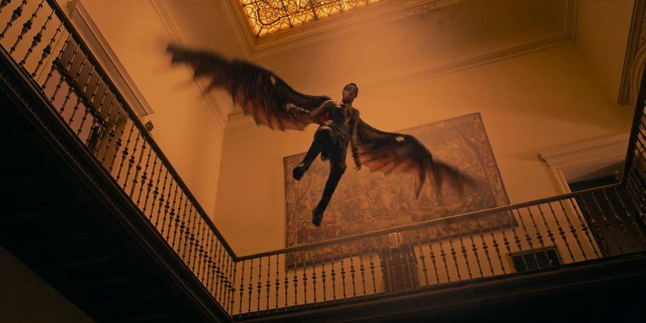 Lilith flies up into the middle of the hall while fighting Ava in the orange light.