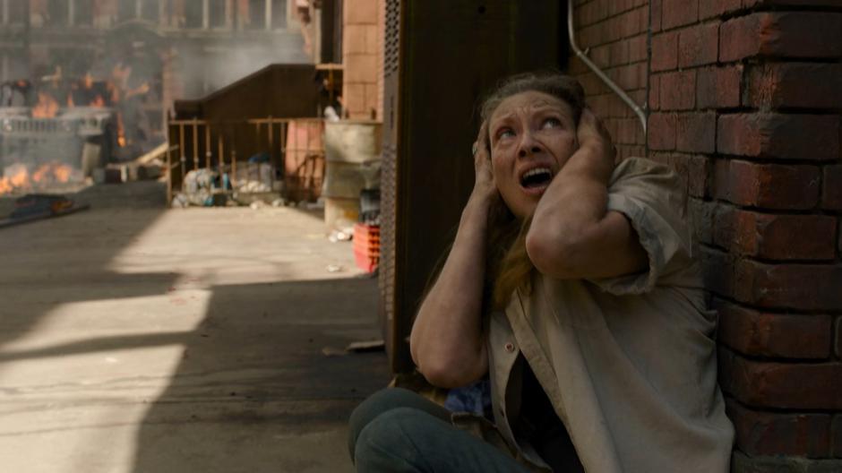Tess ducks down when a sniper fires on the FEDRA soldiers.