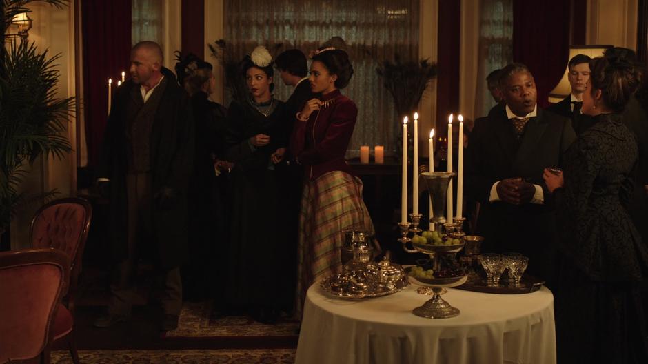 Mick, Zari, and Amaya look around the party filled with fancy people.