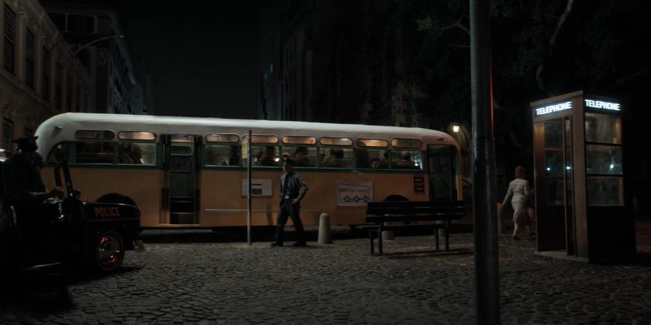 James Blake walks over to the police officers who have arrived next to the stopped bus.