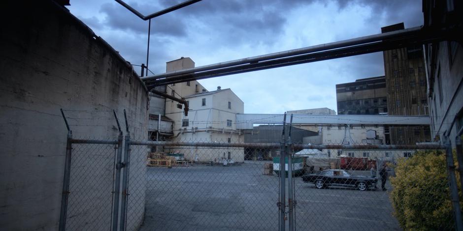 Luca and Hall exit their car and look around the abandoned factory.