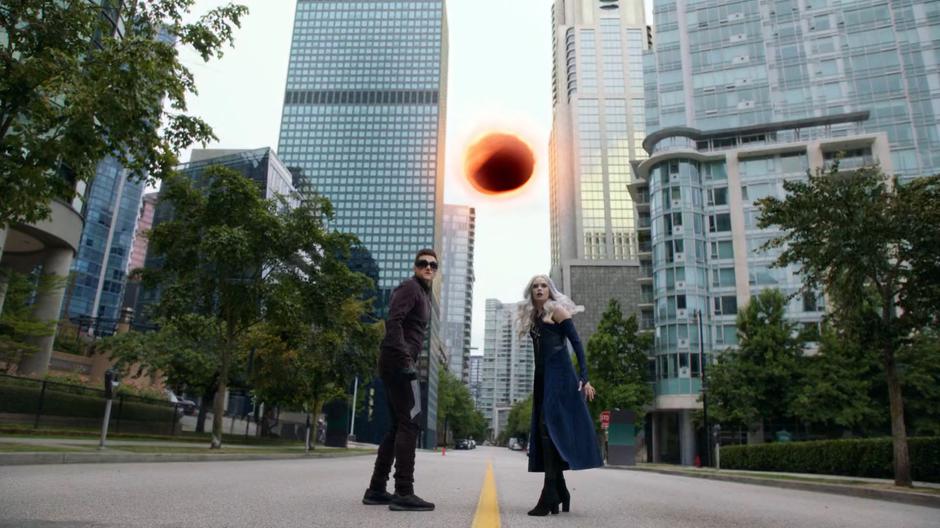Ralph and Frost turn to watch Barry run past as the blackhole looms overhead.