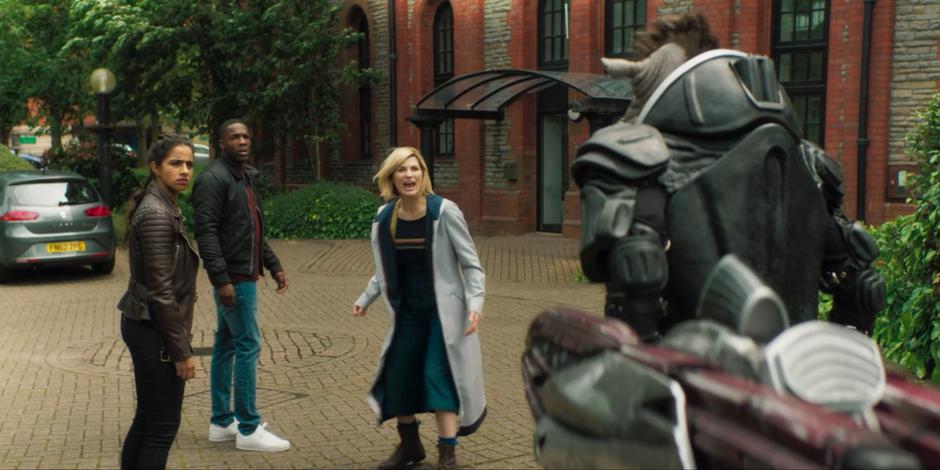Yaz and Ryan look back over their shoulders as the Doctor yells at Pol-Kon-Don.