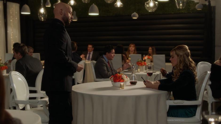 Gemma Cooper looks down at her phone as Lex goes to sit down.