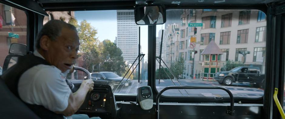 The bus driver looks over his shoulder as the bus drives through an intersection towards a car turning left in front of it.