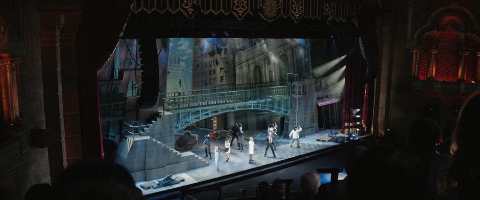 The audience watches a group of performers singing about the attack on New York.