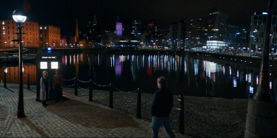 Dan approaches the TARDIS where the Doctor and Yaz are waiting.