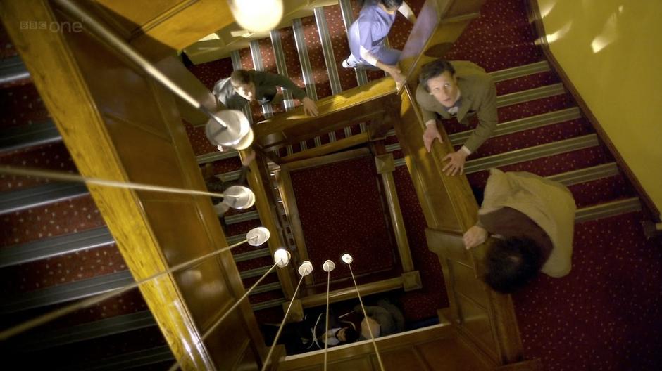 The whole group works their way up the stairs.