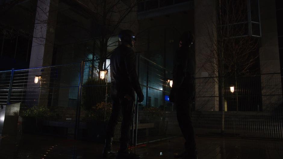 Diggle and Oliver stand in front of the fenced off building.